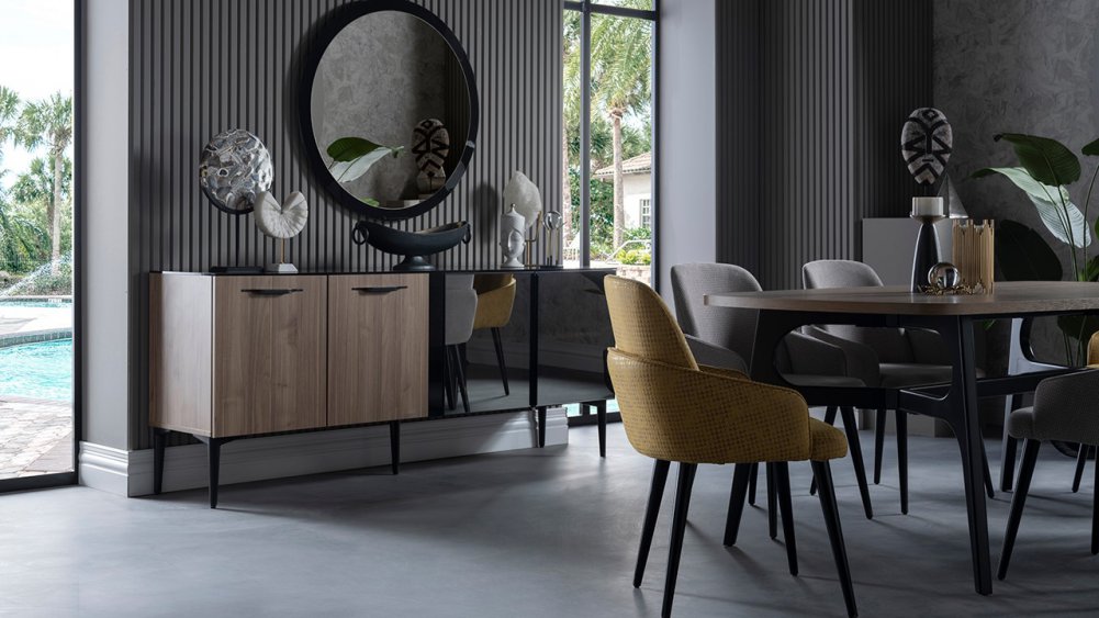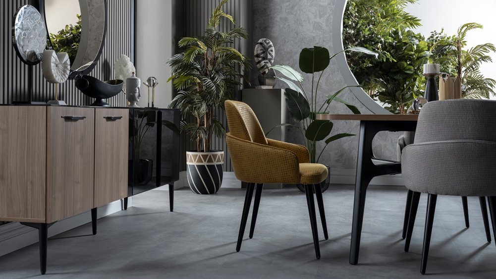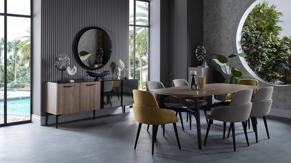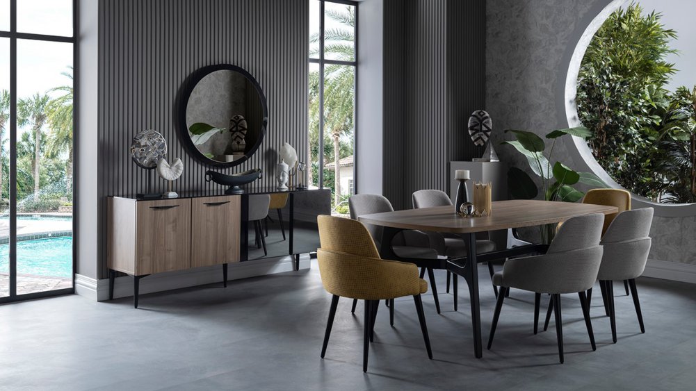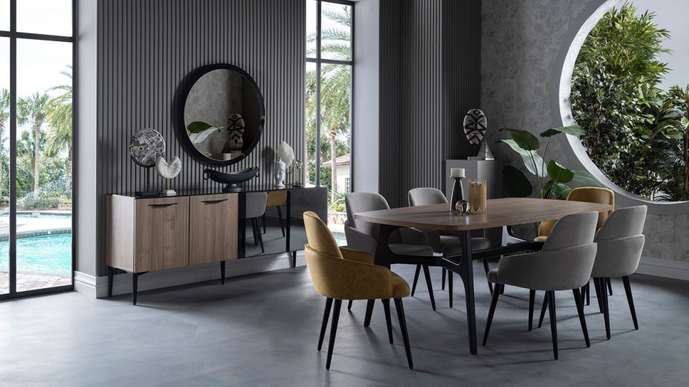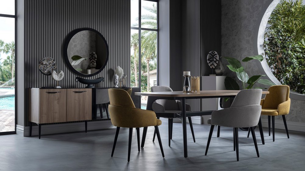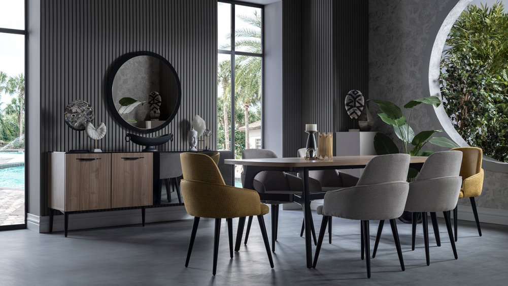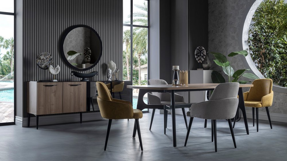 Çağdaş yaşam alanlarını estetik ve şık tasarım dokunuşlarıyla buluşturan MARY YEMEK ODASI TAKIMI, etkileyici görselliğiyle eşsiz bir estetik ortaya koyuyor.