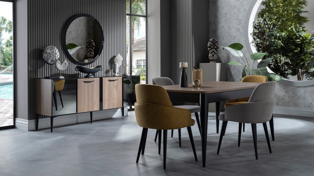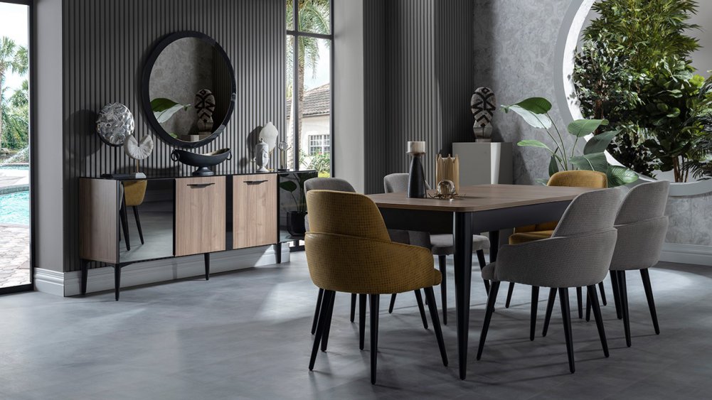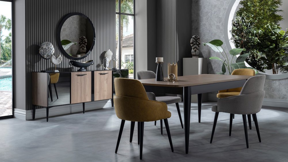 Mary Yemek Odası takımı, görsel zenginliğin yanında işlevselliği ve fonksiyonu da beraberinde sunacak bir takımdır.