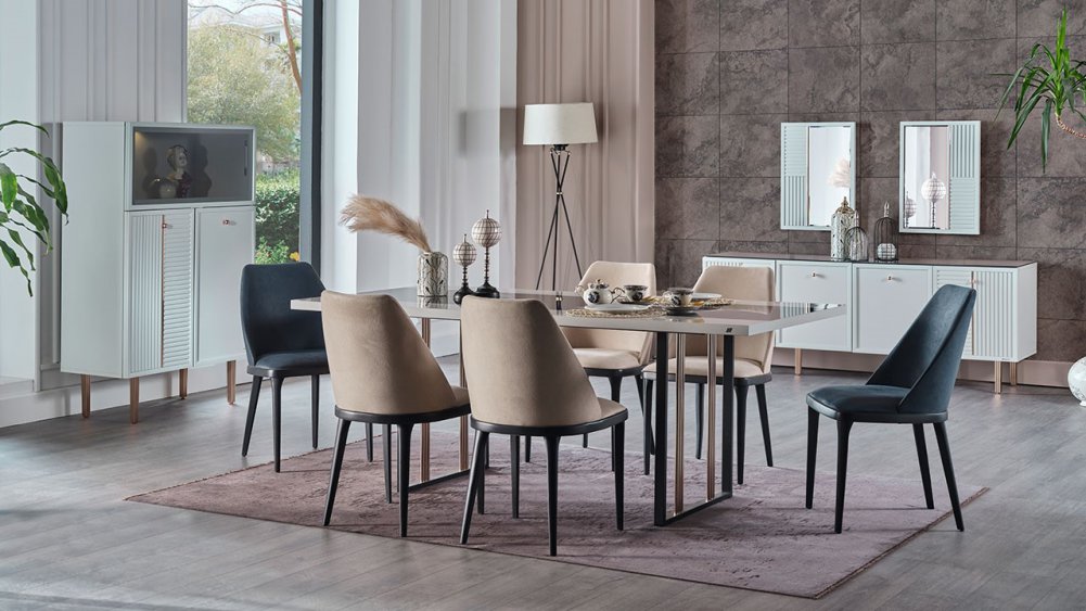 • Modern tarzı ve etkileyici görselliği ile göz dolduran Aren Yemek Odası Takımı su yeşili ve mavi olmak üzere iki renk alternatifi ile sunulmaktadır.