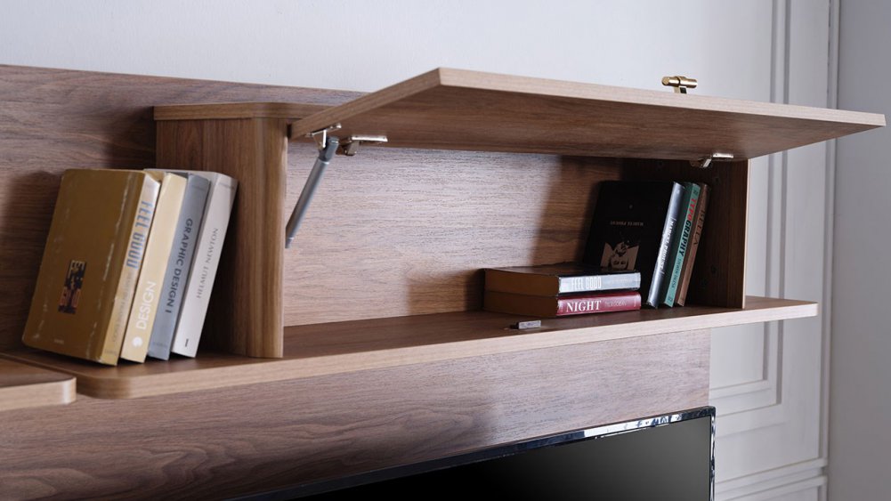 Betty TV Ünitesi ahşap rengin sıcaklığının hakim olduğu tasarımda altın renk detay uygulamalar ile akşam keyfinize artırıyor.