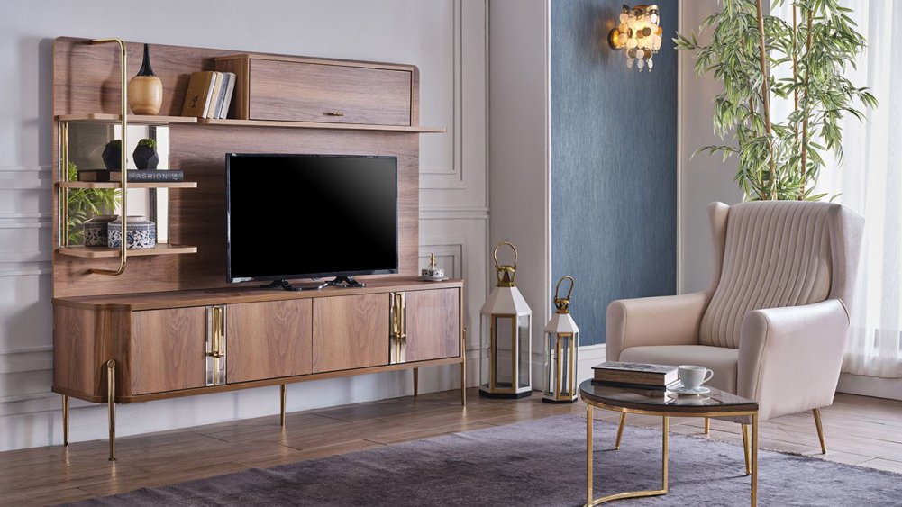 Betty TV Ünitesi ahşap rengin sıcaklığının hakim olduğu tasarımda altın renk detay uygulamalar ile akşam keyfinize artırıyor.