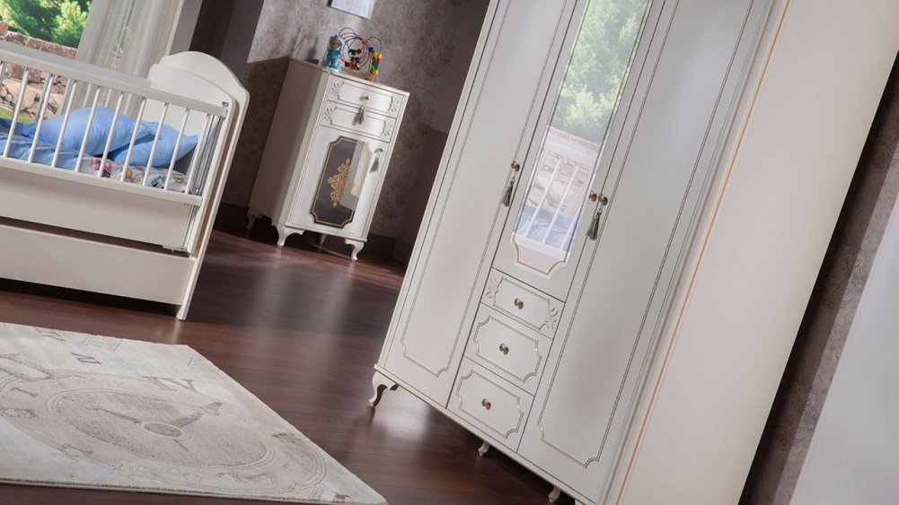 Gold Bebek Odası Takımı kullanılan altın renkli dekoratif işlemeleri, zarif görünümü, kulp üzerinde yer alan püskül uygulaması ve yerden yüksek lükens ayakları ile görsel açıdan ön plana çıkmaktadır.